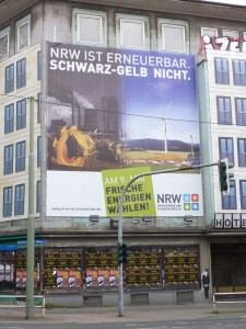 Große Teile des „Hotel Eden“ in der Bochumer City sind verhüllt. Bei dem Gebäudezustand durchaus begrüßenswert. Noch besser: wie es verhüllt ist. Ein riesiges Wandplakat, auf dem in großen Lettern zu lesen ist: “ NRW ist erneuerbar. Schwarz-gelb nicht.“, schmückt das Hotel. Die Landesarbeitsgemeinschaft Erneuerbarer Energien NRW e.V. hat die Zeichen der Zeit erkannt, und setzt voll auf den Wechsel. Unter der schwarz-gelben Landesregierung sind die erneuerbaren Energien höchstens gefälliger Deckmantel, um an den Atomkraftverlängerungsplänen weiter zu arbeiten. Für mich gilt nach wie vor: Atomkraft: nein danke!. Solange es keine Lösung zur Endlagerung atomarer Stoffe gibt, und somit die Probleme der atomaren Energierzeugung zukünftigen Generationen in die Schuhe geschoben werden, gibt es da gar nichts zu rütteln. Es exisitert ein mit der Energiewirtschaft verabredetes Ausstiegsszenario – schwarz-gelb will dies brechen und die ältesten Atommeiler, die als erste vom Netz sollen, weiter laufen lassen. Eine Gelddruckmaschine für die großen Energie-Oligarchen. Viel sinnvoller ist es, den Ausbau regenerativer Energien zu unterstützen. Aus klimapolitischen Gründen, aber mindestens genauso aus wirtschaftpolitischen Gründen. In NRW sitzt soviel know-how in diesem Bereich, dass es fahrlässig wäre, nicht alles zu unternehmen, um Forschung, Entwicklung und Produktion in der Region so zu unterstützen, dass dies zum echten Job-Motor wird. Dabei geht es um Industriearbeitsplätze, denn besispielsweise Windkraftanlagen werden nicht aus Wind, sondern aus modernen Werkstoffen, mit moderner Getriebe- und innovativer Regeltechnik gebaut. Bochum ist auf dem Weg Geothermie-Stadt Nr.1 zu werden. Diese Chancen müssen wir nutzen. CDU und FDP vergeben diese Chancen. Deshalb ist der Wechsel dringend notwendig. In der Energiepolitik und in ganz NRW!