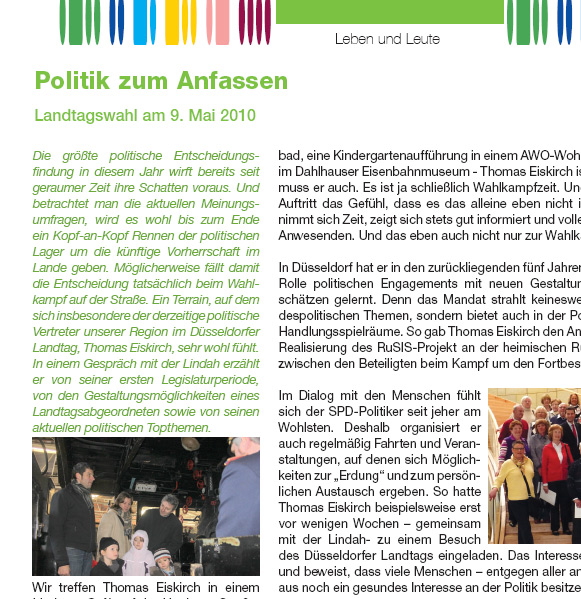 Die Stadtteilzeitung Lindah hat in ihrer aktuellen Ausgabe einen wirklich tollen Artikel über Thomas Eiskirch geschrieben, den wir auch den Leserinnen und Lesern der Internetseite natürlich nicht vorenthalten wollen. Lindah berichtet über die anstehenden Landtagswahlen und über Thomas Eiskirchs Wahlkampf hier im Wahlkreis Bochum II.