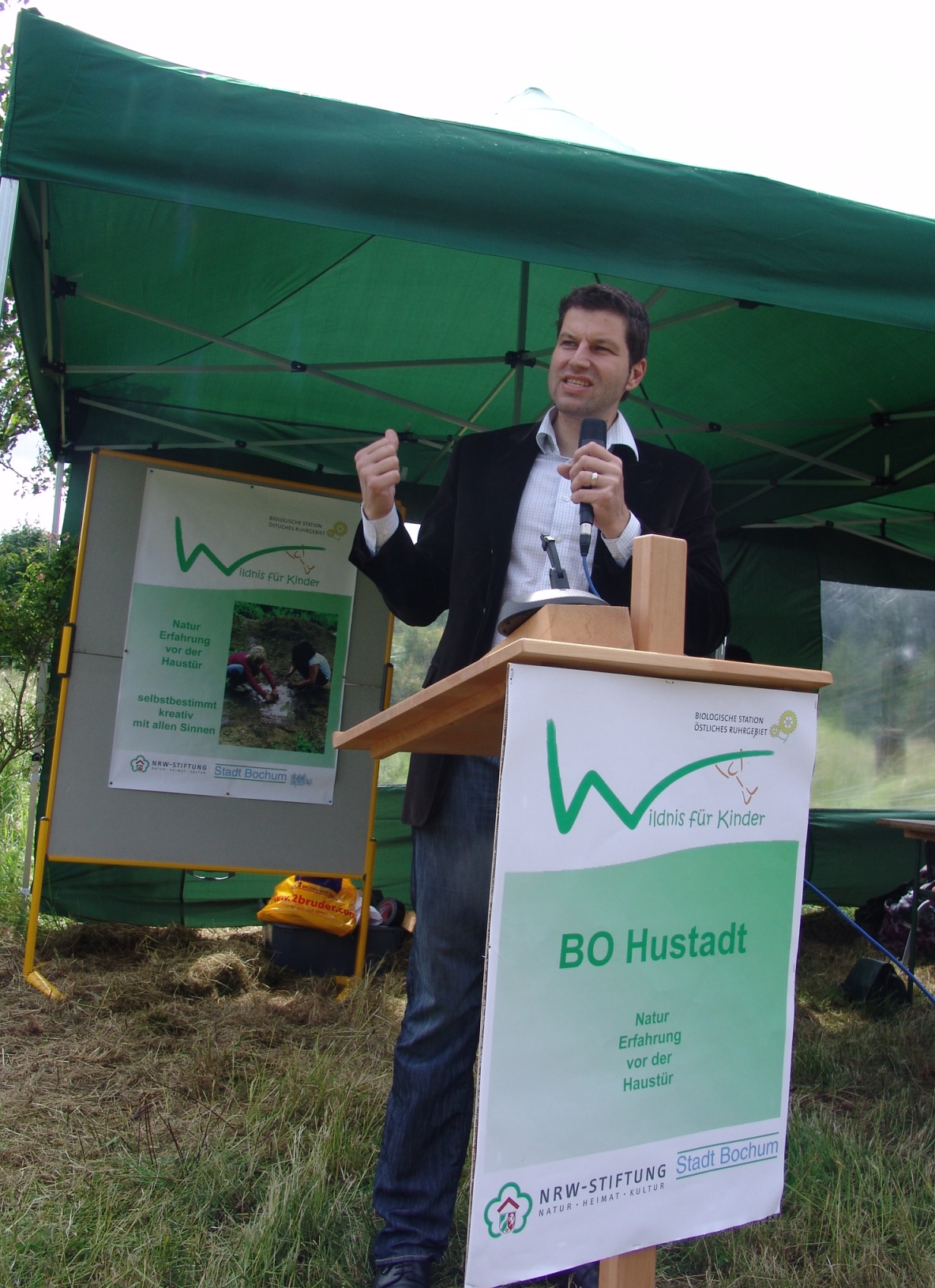 Thomas Eiskirch eröffnet die zweite „Wildnis für Kinder“ in der Bochumer Hustadt: „In meiner Jugend konnten wir auf Bäume klettern, Buden bauen, spielen, im Matsch spielen und Verstecke bauen. In Bochum gab es dafür in den Stadtteilen noch ausreichend Flächen. Es gab auch eine Reihe von Abenteuerspielplätzen. Dort haben wir gehämmert, gesägt, gebaut, geklettert, gematscht und in luftiger Höhe balanciert – alles eben, was das Kinderherz begehrt. Es gab wenig erwachsene Aufsicht. Keiner hat gesagt, was zu tun war. Niemand hat aufgepasst oder vor Gefahren gewarnt. Das war das Spannende. Deshalb freut es mich besonders, dass das jetzt Kinder wieder tun können, wie in meiner Kindheit.“
