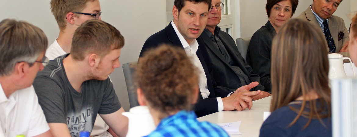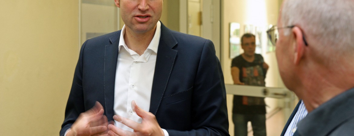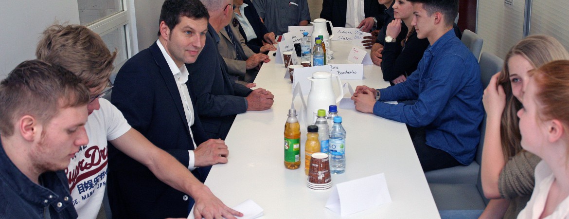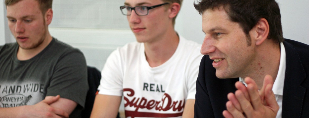 Aber die Schulen definieren sich nicht nur durch Mauern, Mobiliar und Fenster. An den Wänden hängen Kunstwerke von Schülern und Sätze über Toleranz und Menschlichkeit. Die Werte werden im Schulzentrum gelebt: Davon konnte sich Eiskirch ein Bild im Gespräch mit Schülern machen. Die berichteten vom positiven Miteinander, aber auch von fehlenden Geldern. Thomas Eiskirch nahm die Themen mit und will sich kümmern. „Aber ich kann nicht versprechen dass es bald Geld gibt, denn ich will niemand sein, der Versprechungen macht, die er nicht auch sicher halten kann. Ich kann euch aber versichern, dass ich mich kümmern werde“, erklärte das Landtagsmitglied. Die Ehrlichkeit imponierte den Schülern.