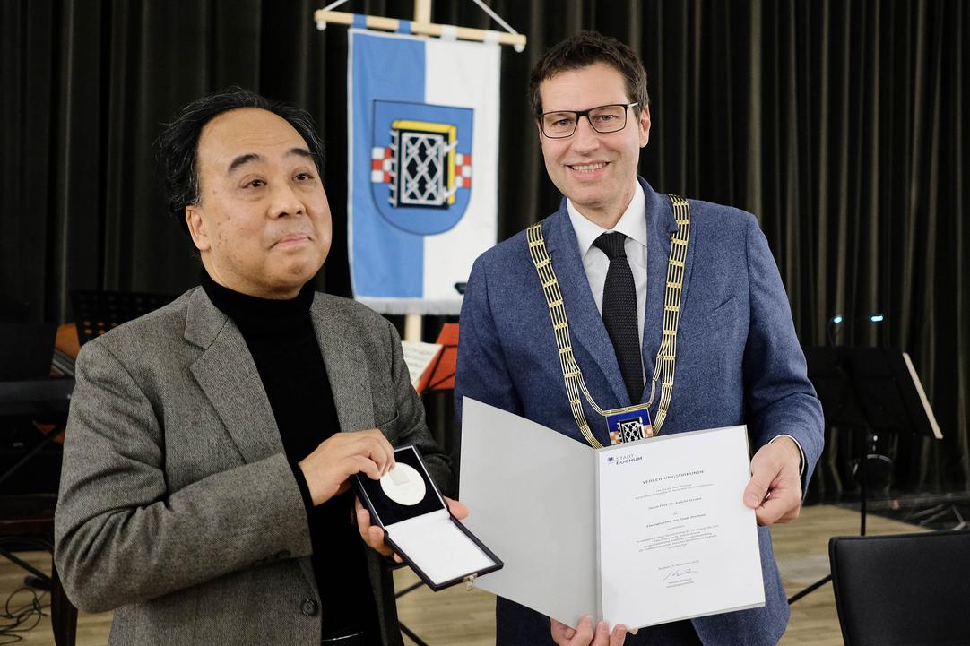 Einem wichtigen Fürsprecher und Unterstützer der Städtepartnerschaft, die Japans Generalkonsulin Setsuko Kawahara als einzigartig würdigte, dankten beide Stadtoberhäupter beim Empfang im Rathaus: Prof. Keiichi Aizawa. Der Leiter des japanischen Kulturinstituts in Köln setzt sich seit Jahren ehrenamtlich und unermüdlich für den Austausch zwischen Bochum und Tsukuba ein und stellt sich bei Arbeitstreffen und Veranstaltungen als Dolmetscher zur Verfügung. Oberbürgermeister Thomas Eiskirch überreichte ihm als Dank und Auszeichnung am Freitag, 11. November, beim Empfang der Delegation im Rathaus und in Anwesenheit der japanischen Generalkonsulin, Setsuko Kawahara, die Ehrenplakette der Stadt Bochum. „Ich freue mich sehr, dass diese Freundschaft zwischen beiden Städten so konkrete Form angenommen hat“, betonte Prof. Keiichi Aizawa. „Schon an der Universität von Tsukuba habe ich mich für internationalen Austausch eingesetzt. Aber mit Bochum war es gleich eine Wahlverwandtschaft.“