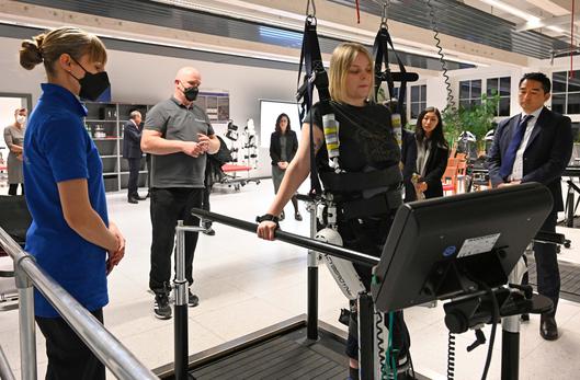 Wie eng die Wissenschaftsstandorte Bochum und Tsukuba bereits verbunden sind, erfuhr die Delegation bei Cyberdyne Care Robotics am Uniklinikum Bergmannsheil: Mit Niederlassungen in beiden Städten nutzt Präsident und Geschäftsführer Prof. Yoshiyuki Sankai Synergieeffekte. Bei Cyberdyne entstehen Produkte, die unter anderem in Medizin und Pflege zum Einsatz kommen. Die Roboteranzüge HAL helfen zum Beispiel Unfallopfern, bei Verletzungen des Rückenmarks sich fortzubewegen und wieder gehen zu lernen.