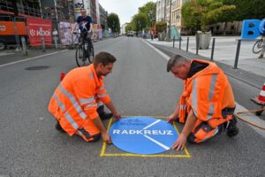 Am Mittwoch, 27. September, hat Oberbürgermeister Thomas Eiskirch das erste Radkreuz-Piktogramm aufgetragen. „Jetzt wird das Radkreuz in der Innenstadt sichtbar“, so OB Eiskirch. „Das Radkreuz ist der innerstädtische Verteiler für den gesamtstädtischen Radverkehr. Der direkte Weg quer durch die Innenstadt ist schneller, komfortabler und zugleich sicherer als der Weg über den Ring.“ An allen Anschlusspunkten an die Cityradialen und an allen Kreuzungspunkten wird deshalb gut sichtbar in den nächsten Wochen das Logo des Radkreuzes markiert.